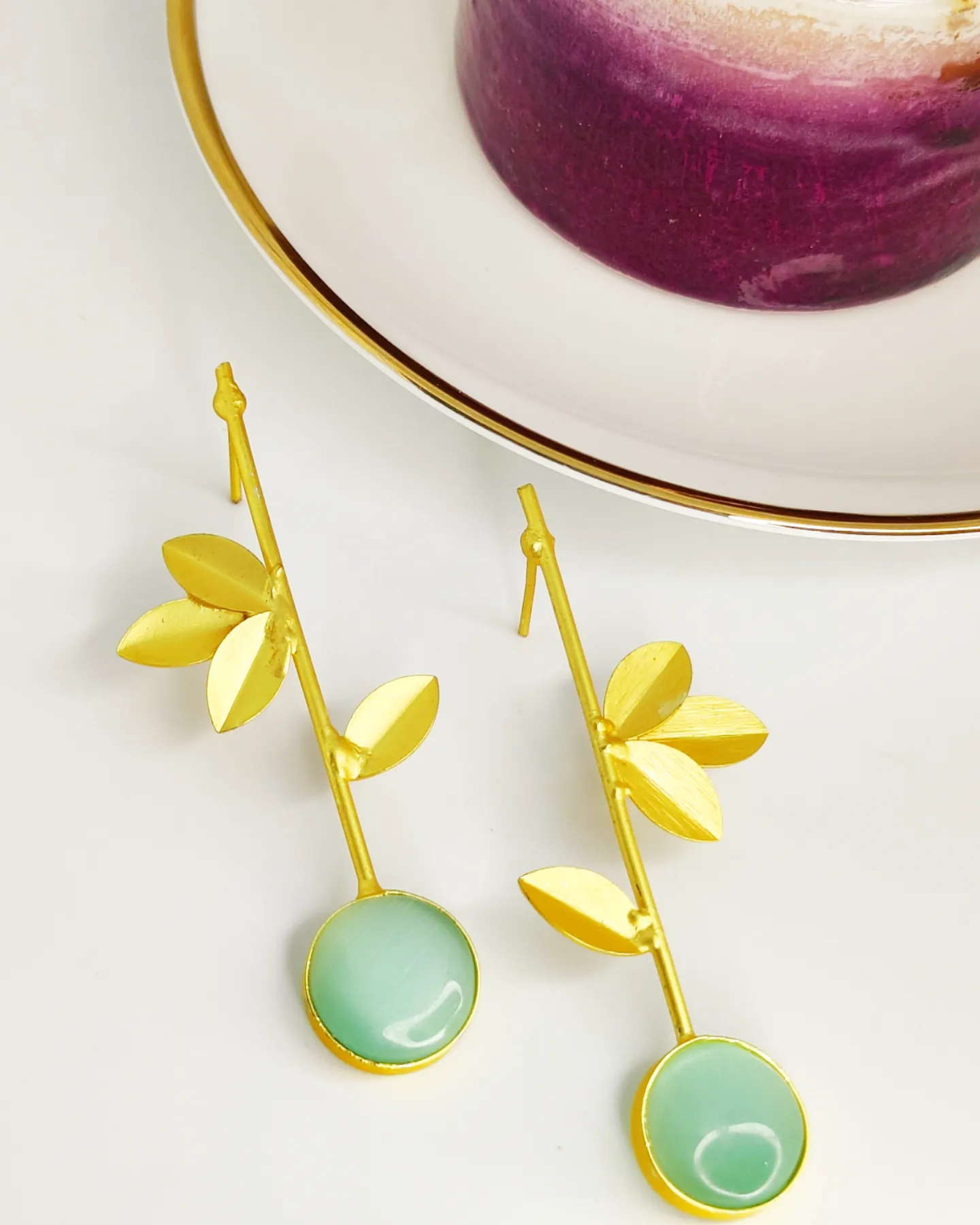 + ShippingGold plated brass earrings with mint green monalisa stone work